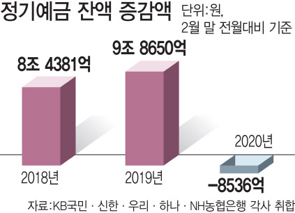 은행의 ‘요구불예금’으로 자금이 몰리고 있다. 22일 KB국민·신한·우리·하나·NH농협은행 등 5대 시중은행의 자유입출식예금과 시장금리부 수시입출금식예금(MMDA)를 합친 요구불 성격의 예금 잔액은 지난달 말 잔액 기준으로 총 557조4516억원으로 집계됐다. 이는 전년동월대비로 14.8%(71조7377억원) 증가한 수치다. 지난 1월 말과 비교해도 한달 사이에 5.3%(28조847억원) 늘어났다. 은행권 한 관계자는 “이달 들어 수시입출식 요구불예금으로 옮겨가는 분위기가 더 분명해지고 있다”고 말했다. |