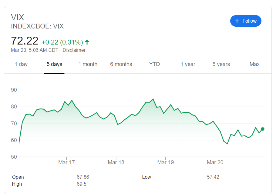 85이상 급등 후 3월 20일경 FOMC 발표 및 각국의 양적완화 발표에 조금은 낮아진 양상이다. 다만 아직도 72.22의 정도의 엄청난 위기 지수를 보여준다. |