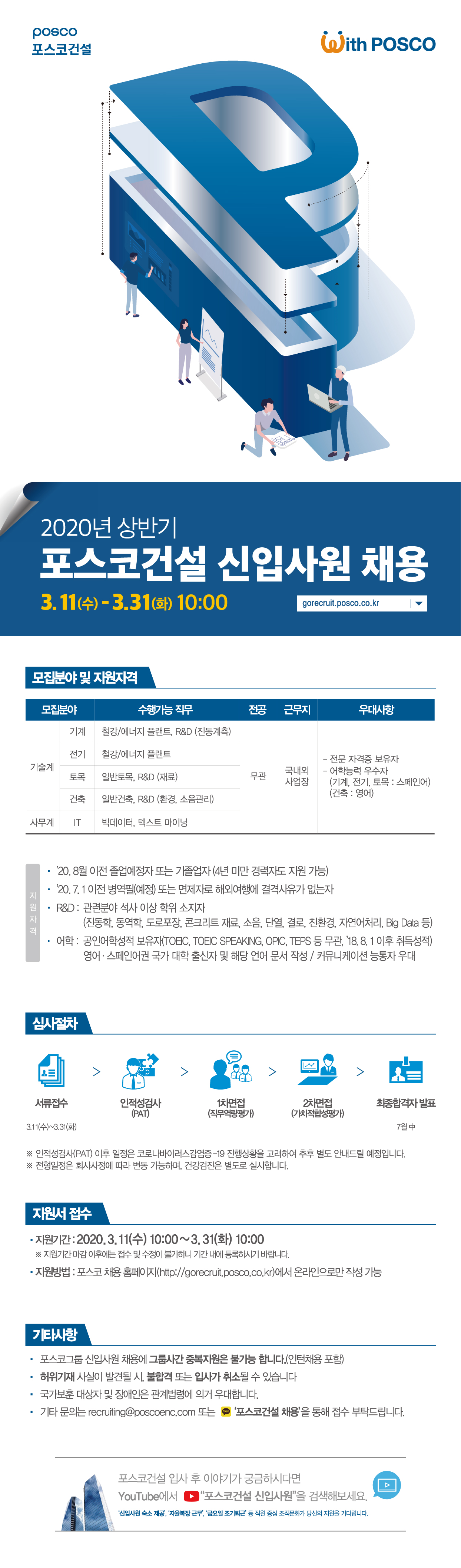 포스코 건설 채용 2020년 상반기 3월 31일까지 신입사원 모집하고 있다.
