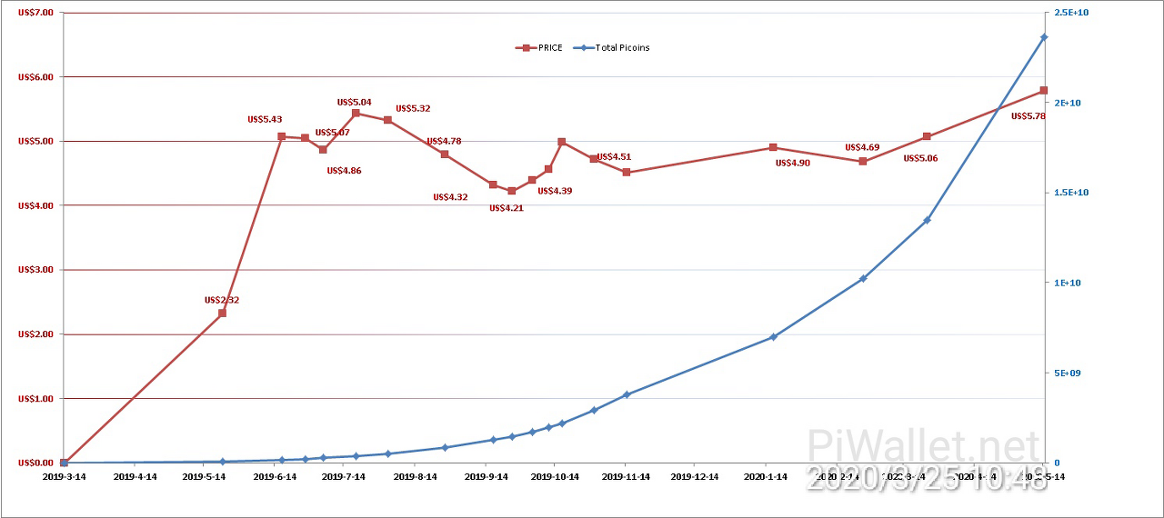 파이코인의 총 발행량과 파이 network 통칭 파이코인의 가격은 비례하는 가치를 가졌다 그만큼 시간이 흘러 성숙도가 높아지고 유저가 많아졌다는 말과 일맥상통하니가. 지금껏 전망치를 보거나 선물로 거래되는 가격에 대하여 포스팅을 했다하면 오늘은 파이 Network 자체적으로 올린 그래프를 살펴보자. 그 그래프에 의거하면 지금까지 대략 얼마 정도 발행되었는지 알수 있다. 3월 14일 기준으로 25억개 정도 발행되었고, 3월 14일 기준으로, 예측 가격은 5.78USD 정도이다. 생각보다 너무 높다. 사실 이 그래프가 중국에서 추측된 그래프라 가장 많은 유저가 있을것으로 보이는 중국에서 상황을 낙관하는 것으로 보이지만 1불 이상의 가치만 인정받아도 상당한 가치가 있다고 하겠다.