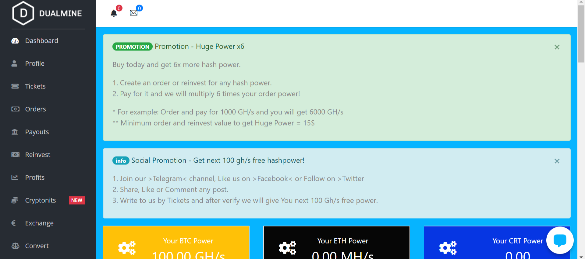 일단 가입을 하면 100Hash Power(GH/s)를 주는 이벤트를 하고 있다 개인 메일로 인증을 해야 되기 때문에 개인메일이 필요하다. 가입을 하고 로그인을 하면 아래와 같은 화면을 볼수가 있다.