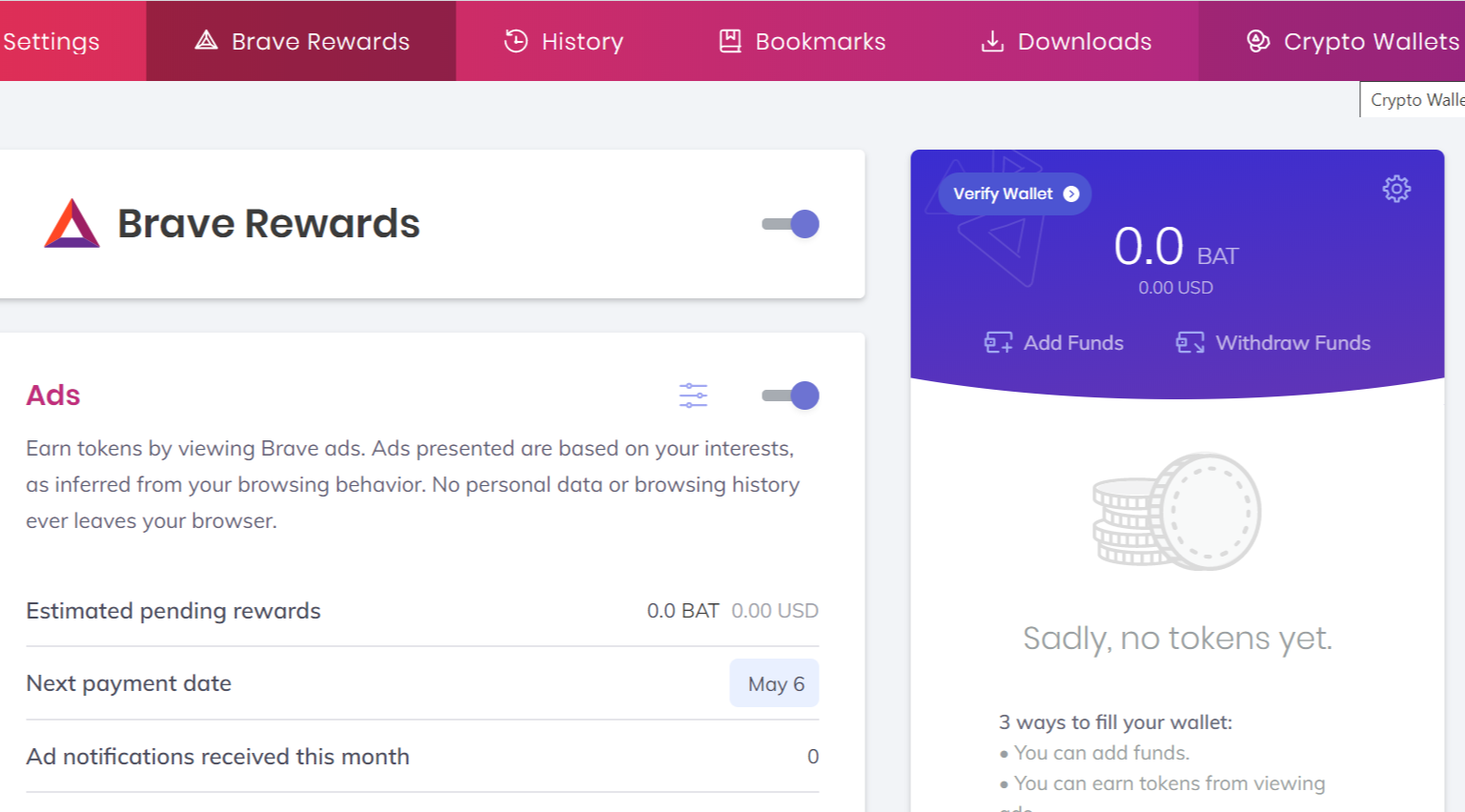 중요한 것은 여기서 광고를 봐도 내 개인정보가 크롬처럼 유출이 되지 않는 다는 점이다. 처음 사용 시 Contents 제작자에게도 보상을 할 수 있게 아래와 같이 옵션이 있다. 아직 Token이 하나도 없는 상태이므로 꺼두는 것을 개인적으로 추천한다. 다만, 양질의 글을 제공하는 사람에게 보상의 기회가 따르는 아주 합리적인 시스템으로 보인다.