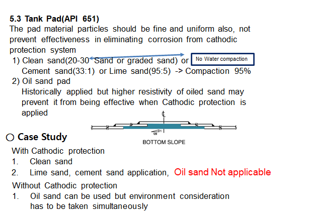 Tank pad의 Soil resistivity에 따라, Tank Bottom의 수명이 좌우되기 때문에 매우 중요한 부분이라고 할 수 있다. 이 경우 우리가 고려할 수 있는 몇가지 경우가 있는데 이 같은 경우는 API 651에서 계략적으로 이야기 해주고 있다. 통상의 경우, 기존에 시공했다는 이유만으로 Oil sand 시공을 고려하는 경우가 있는데 이는 맞지 않다. 대개의 Tank의 경우 Cathodic protection을 시공하게 되는데 Oil sand의 특성 상 저항이 높아져 해당 보호 시스템의 작동이 어렵거나 원하는 performance가 나오게 되지 않는 경우가 많다.