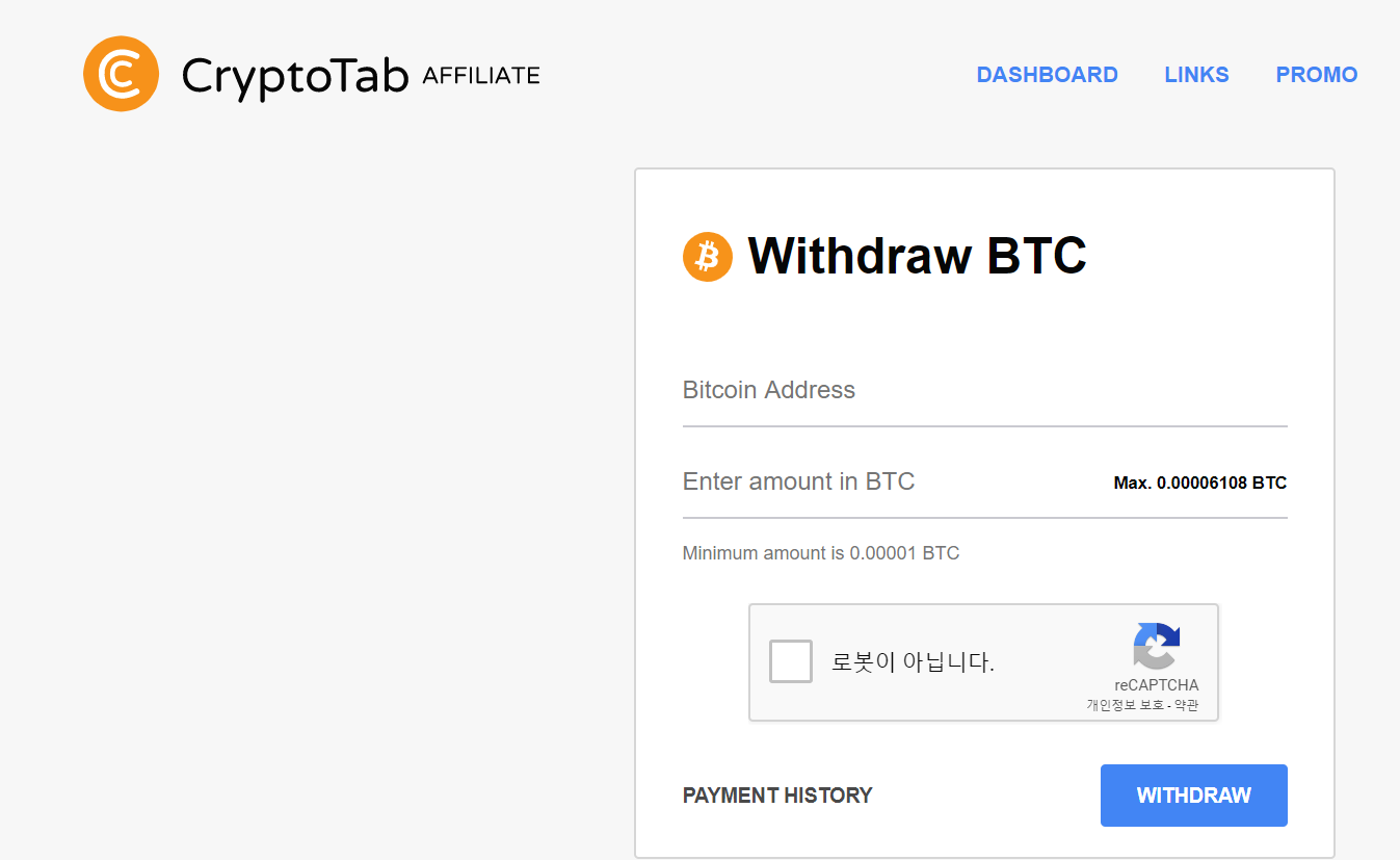 오늘은 크립토탭에서 모은 비트코인을 출금하는 방법에 대하여 알아본다. 비트코인을 인터넷 서핑하면서 채굴하고 싶다면 다음의 링크를 클릭해서 가입하자 https://get.cryptobrowser.site/11926715