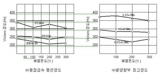 아래 도표는 Cr-Mo 강의 예열온도에 따른 경도의 변화를 나타낸 것으로 결과는 예열온도의 변화에 따라 용접금속, 열영향부의 경도는 약간 저하되며 그 정도는 현저한 차를 나타내지는 않다. 알고 계시겠지만 Min Temperature로 규제하는 이유를 아래 도표에서 찾을 수 있습니다.