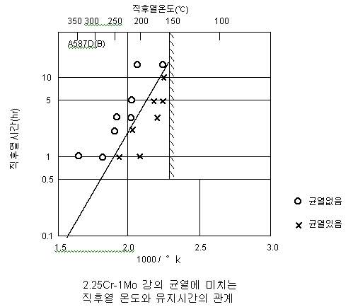 2,25Cr-1Mo 강의 예열 150℃로 용접후 직후열 온도 300℃로 30분 정도 유지하면 균열 발생이 없는 것으로 도표상 나타나고 있습니다.