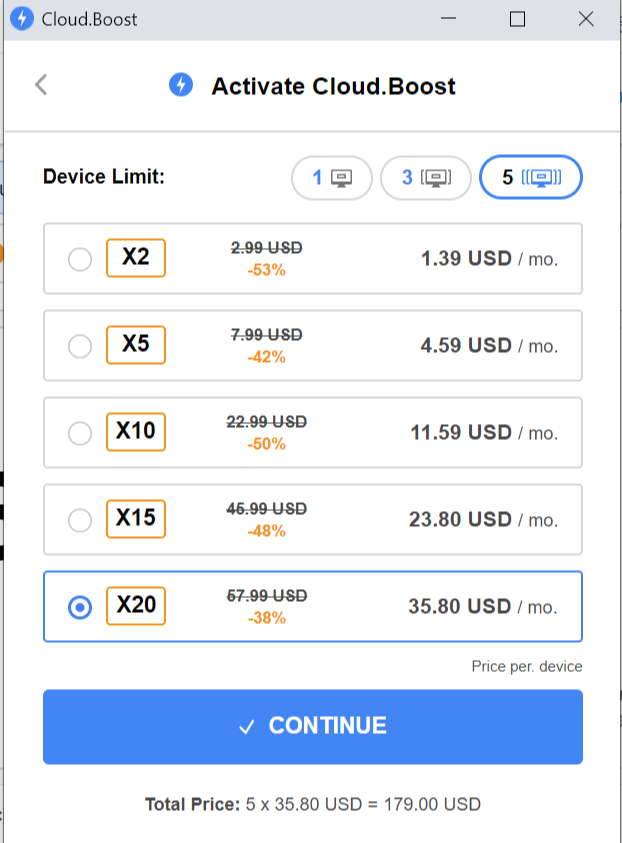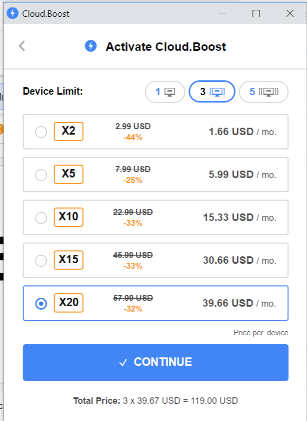 20배속을 기준으로 1대의 경우는 57.99USD(6만원 정도) 3대의 경우는 119USD(13만원정도) 5대의 경우는 179USD(20만원정도 부과됩니다)
