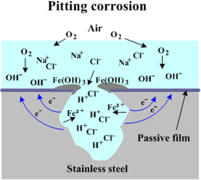 이러한 해리된 이온이 산화피막 중 약화된 곳을 자극 또는 공격하여 산화피막이 깨져서 부식화가 진행되면 Fe(OH)3(수산화제2철)라는 산화물이 생성되게 되고, 이러한 산화물을 부식을 촉진시켜. 결국에 관통하는 구멍을 "점"의 형태로 부식을 발생시키게 되는데 이 부식이 바로 Pitting corrosion입니다.