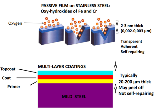 이 산화피막은 통상의 경우 아래와 같이 활동하며, Steel이 녹스는 것을 방지하며, Self repair 즉, 자가수복기능이 있습니다. 이 자가수복 기능은 공기중에 포함되어 있는 Oxygen 즉 산소와 반응하면서, 다시 새로운 산화피막을 형성해서 Corrosion에서 보호하는 기능을 하고 있습니다.