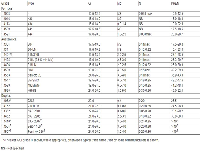 PREN = 1 × %Cr + 3.3 × %Mo + 16 × %N 과 같이 각 원소을 함유량으로 계산이 가능합니다.