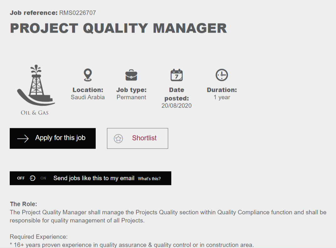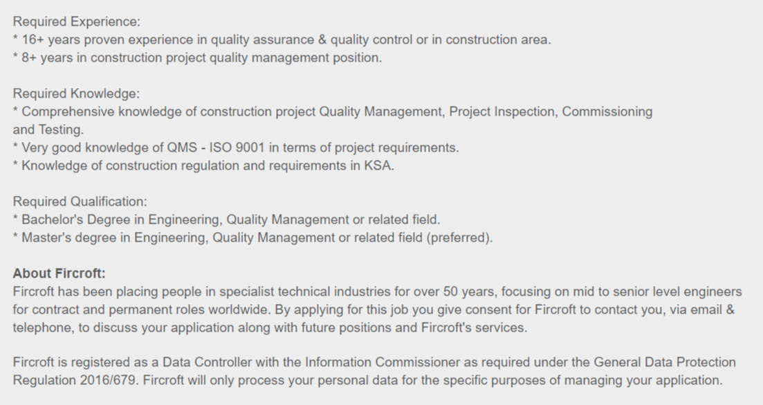 매니저 Position은 좀 긴 경력을 요구하고 있네요. 16년이상의 경력이 필요한 Job으로 보입니다. 최소 경력이 20년은 되어야 Application 하고 Short list에 들어갈 가능성이 있겠네요. 역시 Aramco Position 같이 보이지만 최소 확인이 되어야 회사를 Open할 것으로 보입니다.