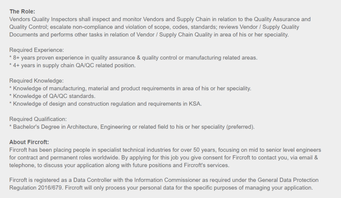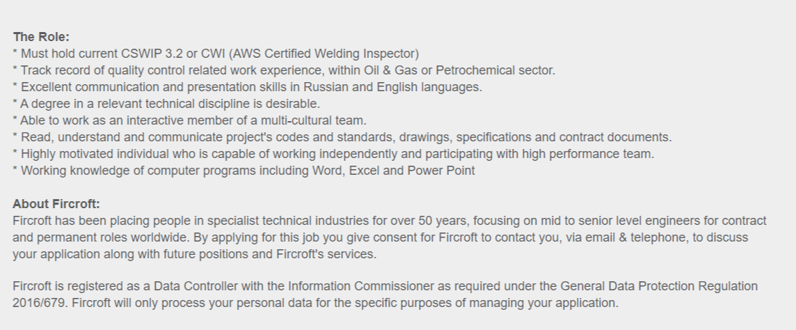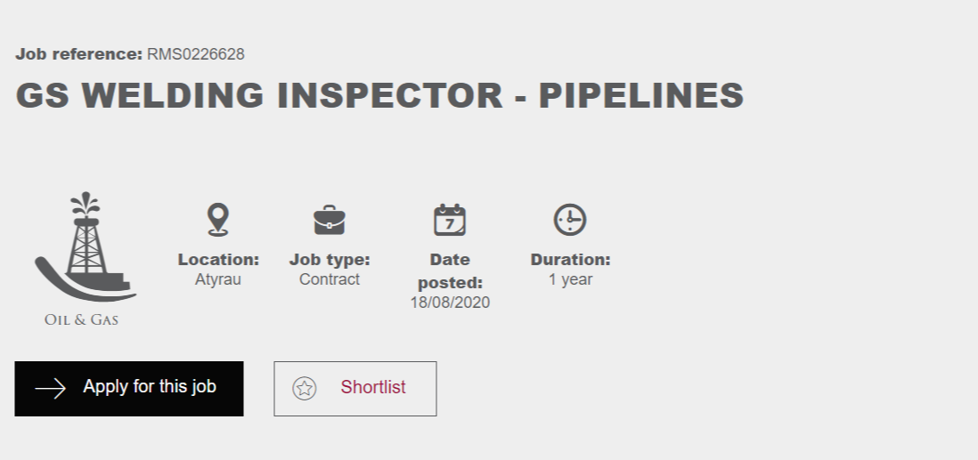 용접 검사원 포지션입니다. CWI나 CSWIP의 자격증을 요구하고 있네요. 3.2를 요구하는걸로 보아 이 분야로는 좀 과한 자격증을 요구하는 것처럼도 보이네요. 찾는 위치는 카자흐스탄의 Atyrau라는 동네입니다.