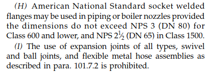 위에서 언급한 것처럼 Process Piping 31.3에서는 아래와 같이 관경 NPS 2이하에서만 사용이 가능하도록 명시하고 있습니다(does not exceed NPS 2)