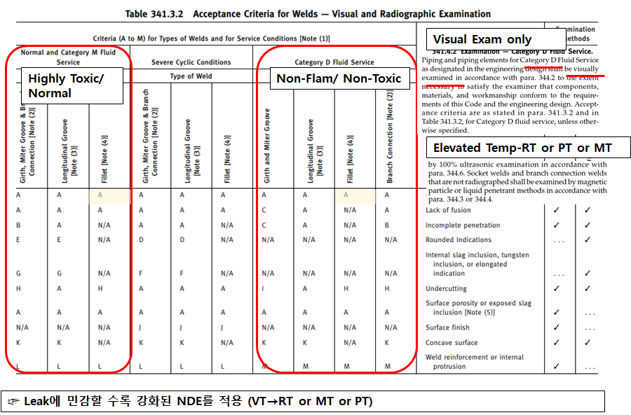 그래서 유체의 성격이나 Operation 성격, 온도등의 환경적 사항이나 용접의 형상에 따라 적용되는 NDE도 아래와 같이 틀려집니다.