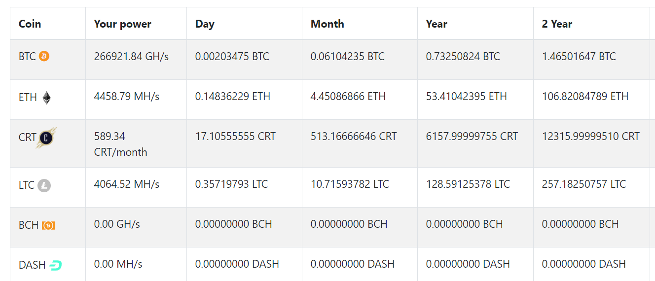 ETH의 경우는 20ETH를 5차례에 나눠서 했습니다. 중간중간에 CRT Air Drop이 겹쳐서 받아서 현재는 받는 금액이 한달에 600USD정도 되네요.(이 CRT는 듀얼마인에서 만든 Coin인데, Stable Coin이라고 생각하시면 됩니다. 하나의 가격이 1USD와 연동하는 것이 목표입니다. 현재는 그렇게 운영되고 있고요)