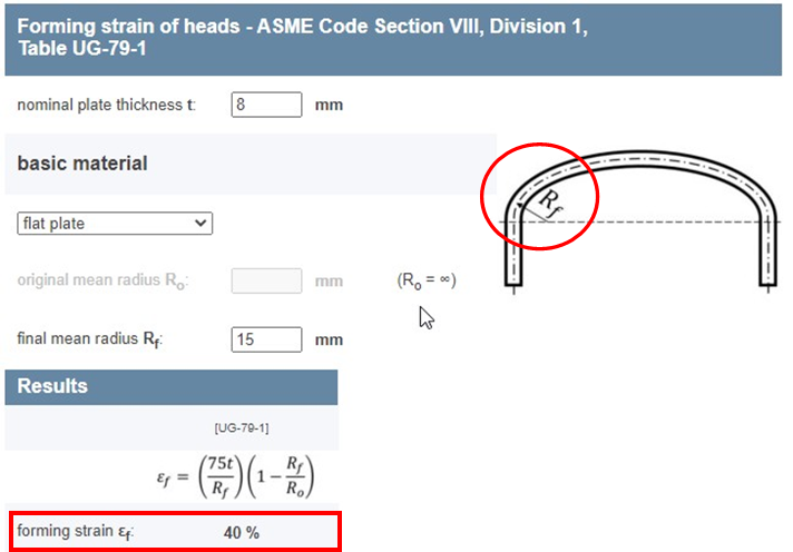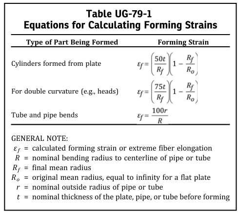 ASME UG-79은 아래와 같이 Forming되는 부분의 Strain을 정해진 식에 따라, 구하게 되어 있습니다.