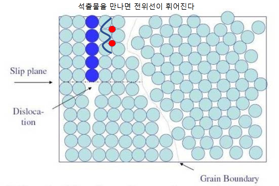 나중엔 휘어지다가 전위환을 형성하며 전위는 빠져나오고 Slip Plane을 따라서 계속 진행하게 되죠. 휘어지는 과정과 전위환을 형성하는 과정에서 기존에 있던 전위가 길어지므로, 그만큼 많은 에너지가 지나가는데 소모되게 되고 이는 즉 전위를 옮기는데 많은 에너지가 들어간다는 이야기와 같으므로 강도가 증가한다는 말입니다.