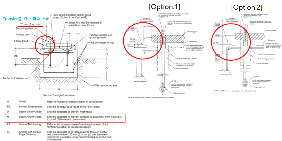 Option.2는 Foundation 과 Grout가 일체형으로 되어 있는 타입입니다. Vibration의 적정한 Transfer를 위해 최소 간격이 규정되어 있습니다. Anchor Bolt의 위치에 대한 Criteria는 AISC, ACI에 규정되어 있습니다.