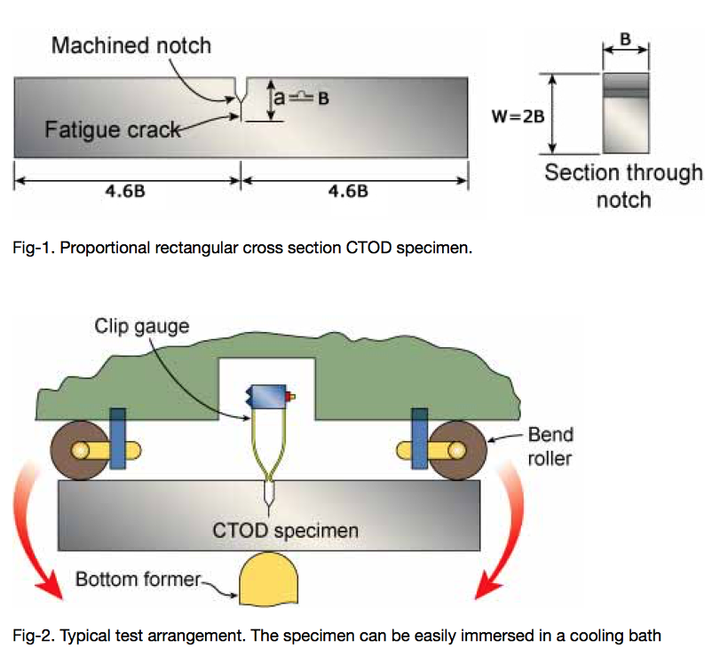 Impact test의 종류는 Charpy V-notch test, IZOD test 등 익숙하신 분들이 많을거 같습니다. 실제로 WPS 만들고 할때도요구하는 경우가 많고 저온 Cryogenic service 할때 확인을 하는 경우가 많아 해보신 분들이 많을 거 같습니다. 균열에 의한 감수성을 확인할때 하는 시험이 CTOD라고 있는데, 이건 위에서 나오는 Charpy Test와는 다른 개념입니다. CTOD는 Crack Tip Open Distance의 약어입니다.
