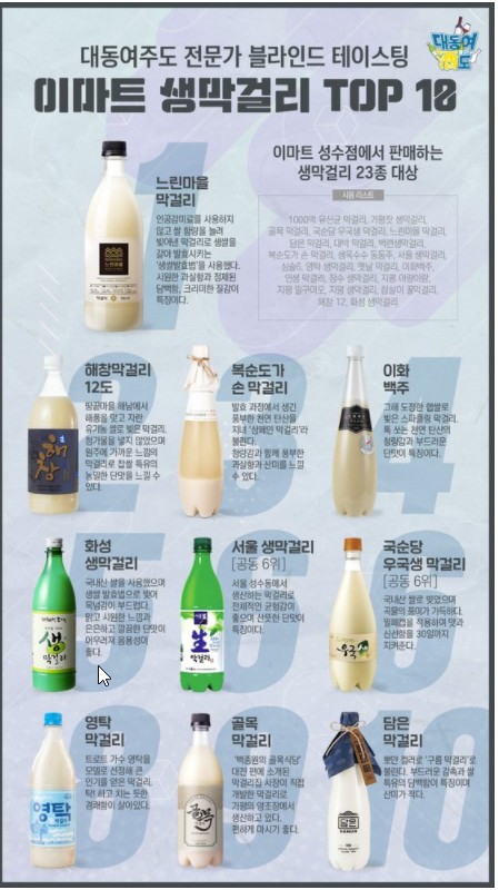 다음은 1위~10위까지 막걸리의 특징과 맛 그리고 어울리는 안주를 정리한 내용이다.
