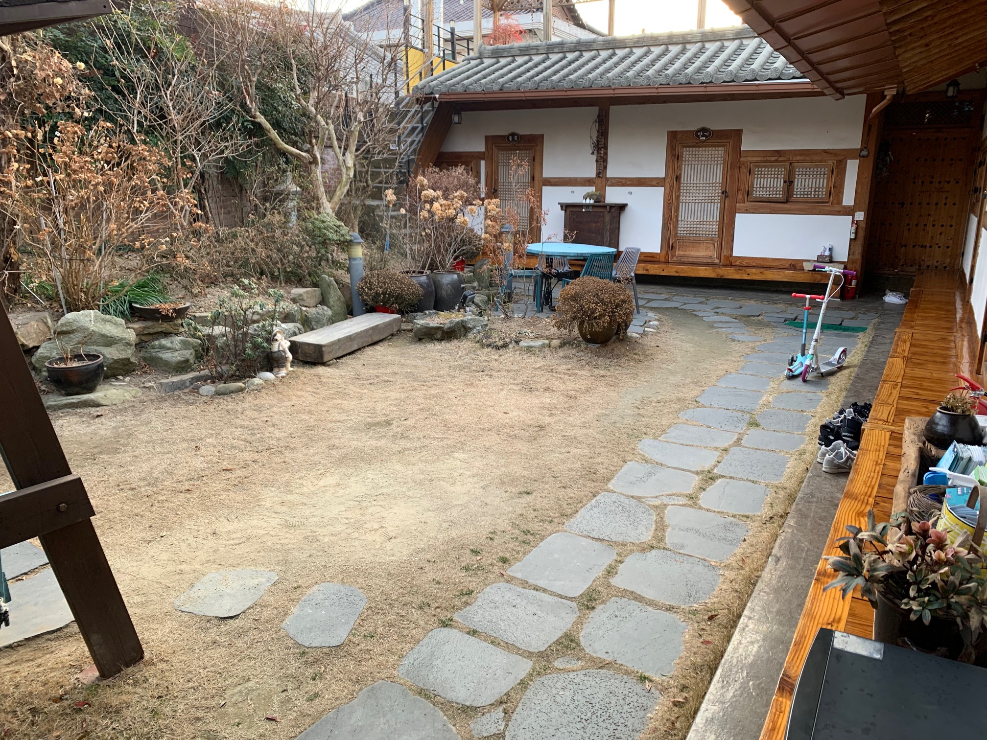 아름다운 정원상을 받았다고 써 있습니다. 정원이 정면 그리고 좌측 통로를 지나면 나오는 후면 정원에 2군데 에 있습니다. 장독대가 있었던 곳을 개조한거 같은데. 그곳에 자그마한 스카이 데크가 위치하고 있습니다. 날씨가 좋아 차나 한잔 하고 싶었습니다.