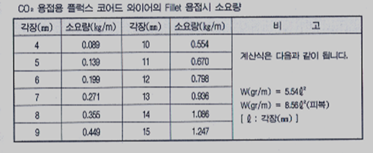 각장에 따른 FCAW의 용접시 소요량에 대한 계산식에 따른 표입니다. 간편하게 각장에 따라 소요량을 예측할 수 있습니다. 참조용으로 계산하여 FCAW 용접봉 발주내실 때 사용하셔도 됩니다. 혹은 용접봉 회사마다 관련 자료가 있으니 관련 자료 참조하셔도 될 거 같습니다. 그게 좀더 정확할 수 있습니다.
