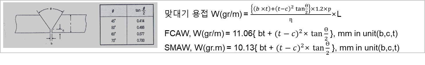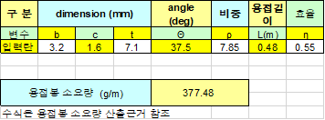 계산이라고 하면 거창하시면 결국에는 중학교 과정에서 배운 부피를 구하는 과정입니다. 거기에 용접 효율과 타입별 비중을 곱해주는 과정입니다.