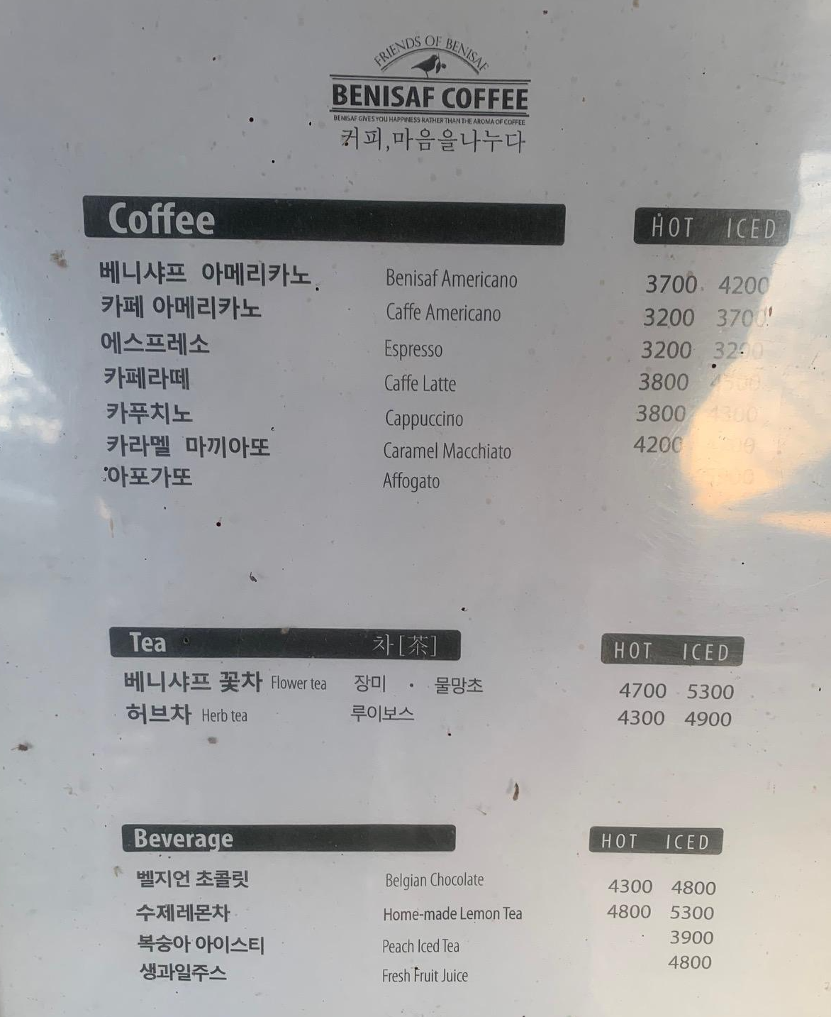메뉴의 가격은 가게 바깥에서 찍은거라 지금 가격과 약간 상이 할 수 있음. 드립이 있어서