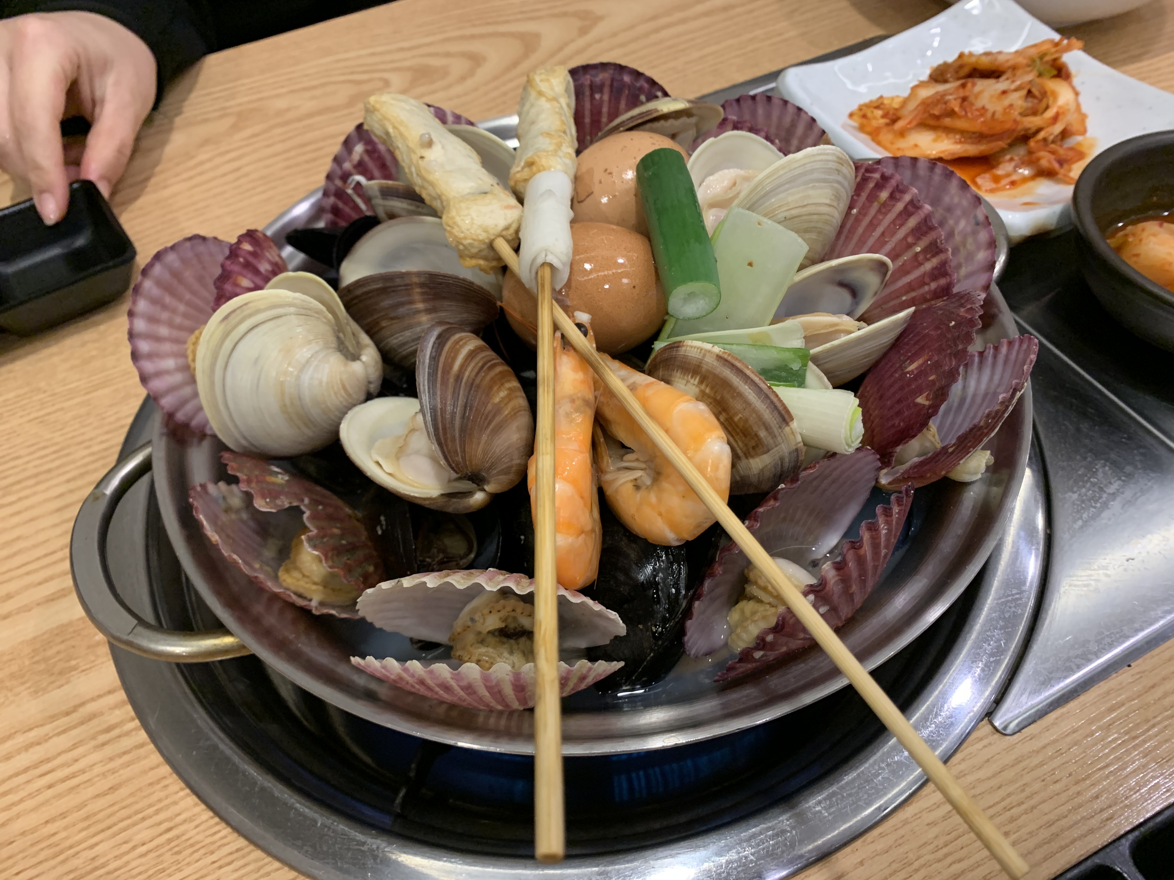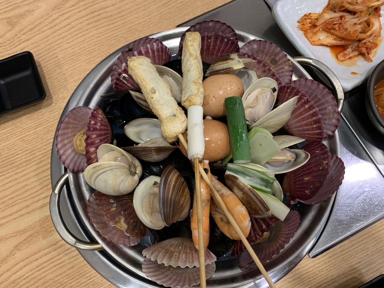 기본 조개(동죽이던가요?), 가리비, 오뎅 등등이 들어가 있습니다. 가리비부터 먹다보면 다른 것들도 다 익고요. 기본 반찬으로 제공되는 김치와 약간의 반찬들도 맛있습니다. 다 드시면 셀프로 드시면 됩니다.