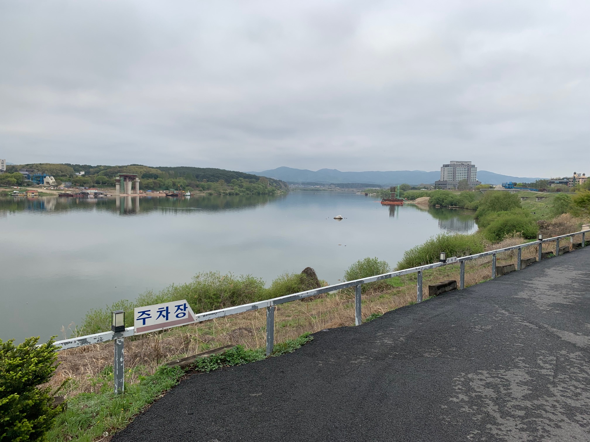 강변을 따라 더 큰 주차장으로 가는 길이 있습니다.