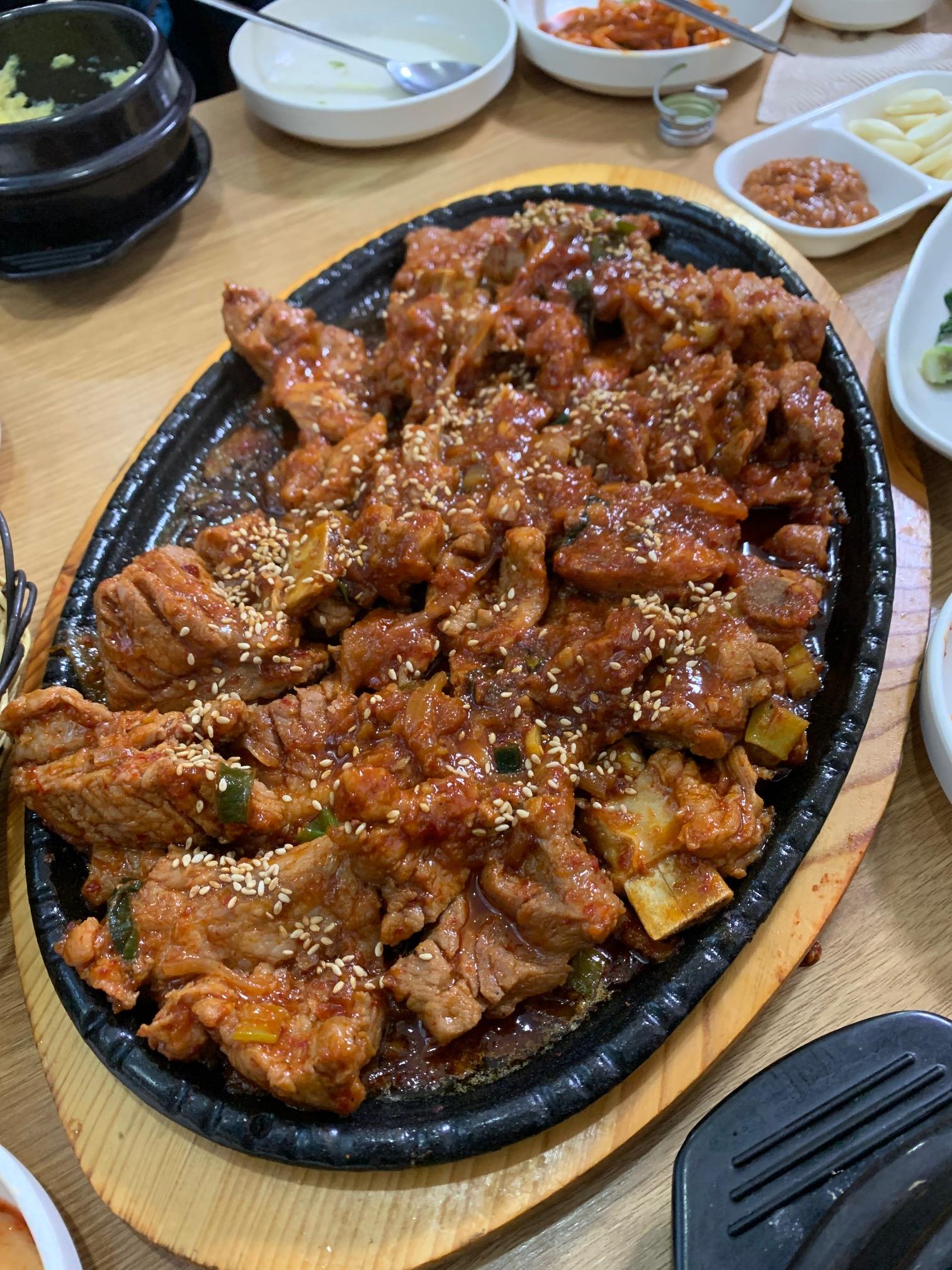 반찬은 그날 그날 틀립니다, 오늘은 직접 담금 반찬에 두릅 철이라 두릅을 주셨습니다. 완전 로컬 맛집입니다. 근처에 근무하시는 지인들 덕분에 제대로 된 로컬 맛집을 찾았습니다. 뽈찜 집이라 뽈찜이 메인인거 같은데 돼지 갈비 사실 저한테는 이게 메인이었습니다, 배부른 상태인데도 훅훅 들어가더군요.