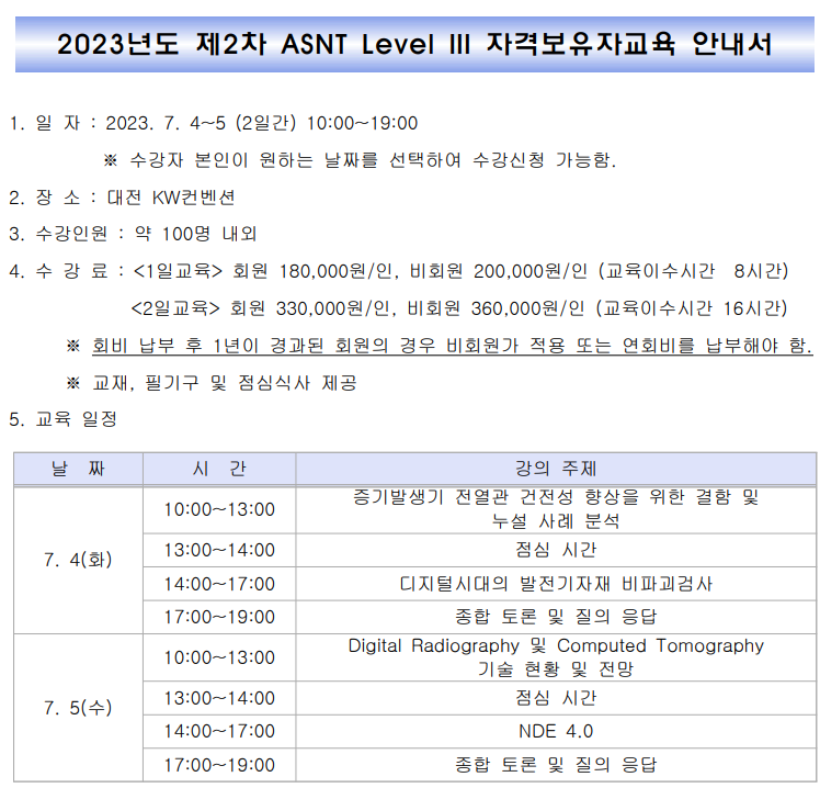 특히나 오늘 다루고자 하는 ASNT는 특히나 일반적인 교육보다는 지금까지 국내 비파괴 학회가 개최하는