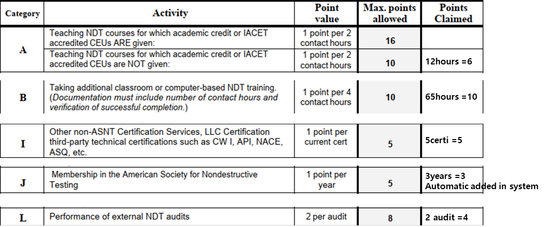 다만, Audit는 ISO 혹은 현장 전반적인 NDE에 대한 내용을 다루어야 하기 때문에 어려우실 수도 있으니 일반적인 경우에서는 위와 같은 강의/교육/자격증/멤버쉽 4가지의 Category도 25점을 채우시길 권장드립니다.